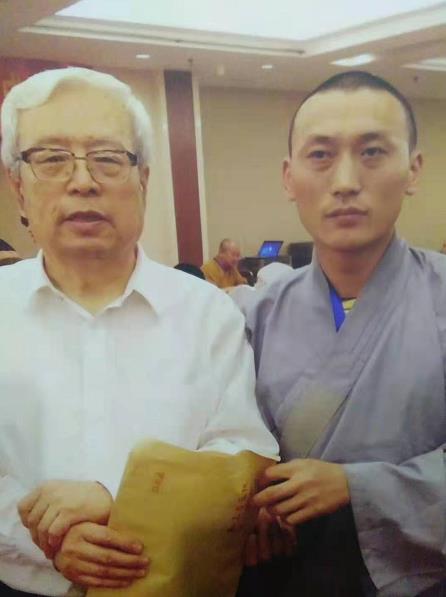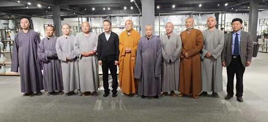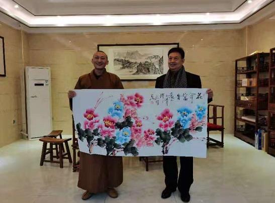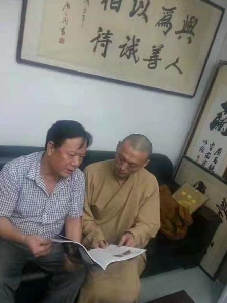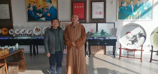 全国人大代表、中国陶瓷艺术大师、国务院特殊津贴专家、中国工艺美术大师、山东省政协常委、淄博市刻瓷艺术家协会主席、王一君大师会见中国少林杂志社社长释延明法师合影留