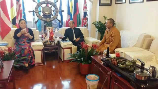 释延明法师(左一)会见全国政协委员、中国佛教协会副秘书长、河南省佛教协会副会长、洛阳市佛教协会会长、白馬寺方丈释印乐大和尚(右一);河南省佛教协会副会长、新乡市佛教协会会长、定国寺方丈释心舫大和尚(中)