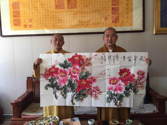 释延明法师会见中国佛教协会常务理事、山西省佛教协会副会长、山西省人大代表、五台山佛教协会会长、五台山黛螺顶主持释昌善法师合影留念